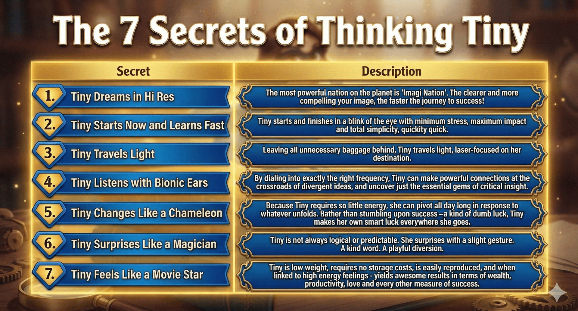 Tiny unleashes incredible time-bending powers by first imagining a super high-definition vision of what her future will look like, always keeping it clearly in sight. In the palace of her mind’s eye, she constantly plays her dreams and goals on the biggest, most vivid flat screen TV you’ve ever seen. This is why leap-frogging into the future with Tiny can feel so easy. Simply by staying overwhelmingly clear about what you’re trying to achieve makes countless tiny things in your life line up in a pleasant and effortless fashion. While the logical brain plods along in a linear predictable fashion, our subconscious emotional mind responds to the potent combination of vivid images and exciting feelings and uses them to leap frog one tiny step at a time into the future. The most powerful nation on the planet is “ImagiNation”.